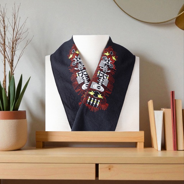 文字から波動が出ているようなデザイン「立春大吉日」 エスニックな雰囲気もある半襟です。 織さん、蜜さんにコーデにしやすいお色をチョイスしていただきました♪ 赤や黄色が入っている方の半襟です。 モノトーンは蜜さんのチョイス。 糸色が変わると印象が変わりますね。 お好きなほうをお選びください。 自宅でお洗濯が出来ます。 アイロンは中温でお願いします。 布:綿100% 糸:ポリエステル100 サイズ幅約17㎝×長さ約110㎝ 日本製