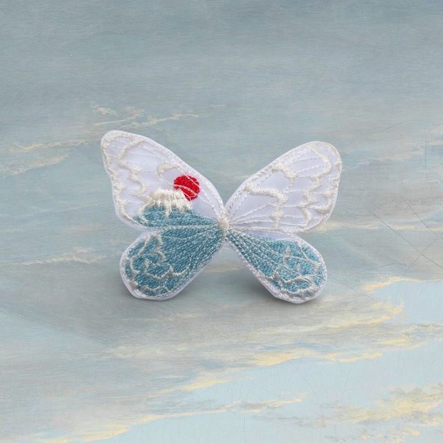 バタフライのブローチ富士山登場です。 人気のバタフライ、青の富士山バタフライよりも少し小さめ。 富士山と太陽を刺繍しました。 おめでたいお正月になりそうですね。 サイズは9㎝×高さ約6,2㎝ もう一回り大きめバタフライ富士山もございます。(左右約10㎝×高さ約7㎝) サクラのバタフライ(別売り)と一緒に並べるとさらに豪華! 素材 布:オーガンジー・ポリエステル100% 糸:ポリエステル100%