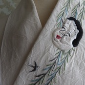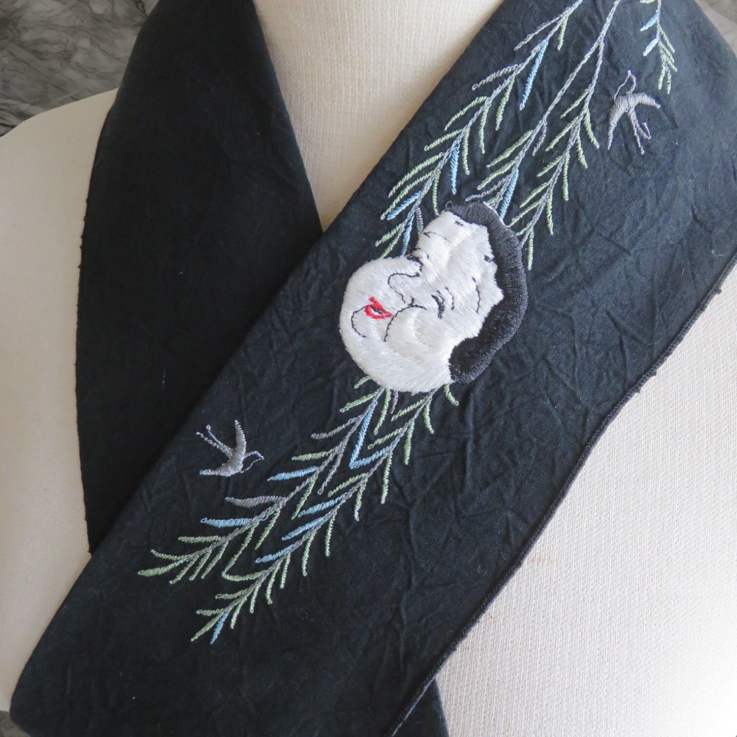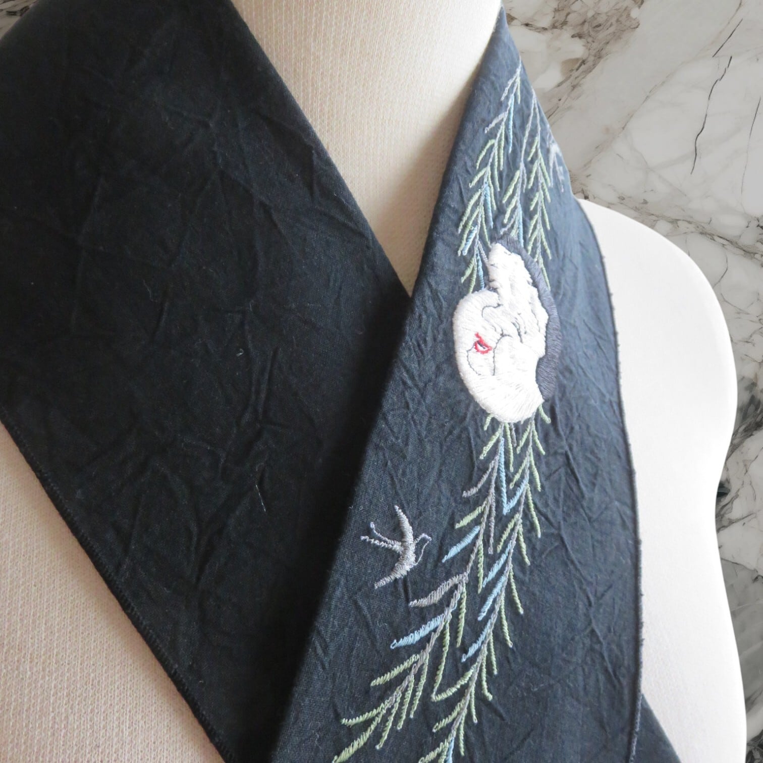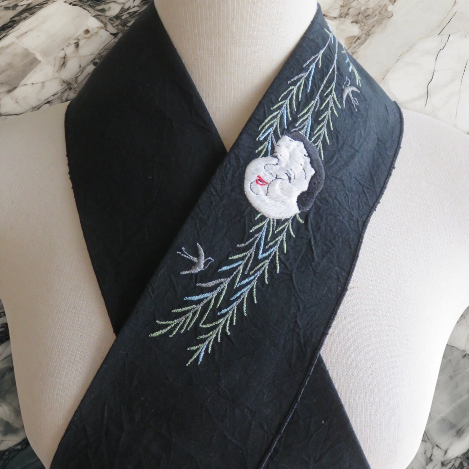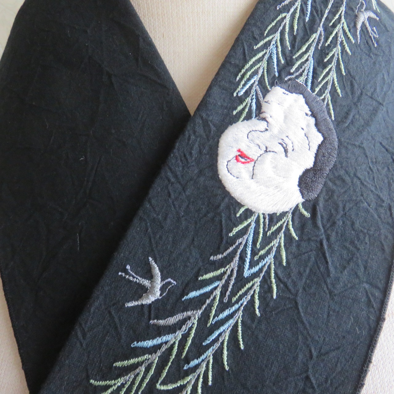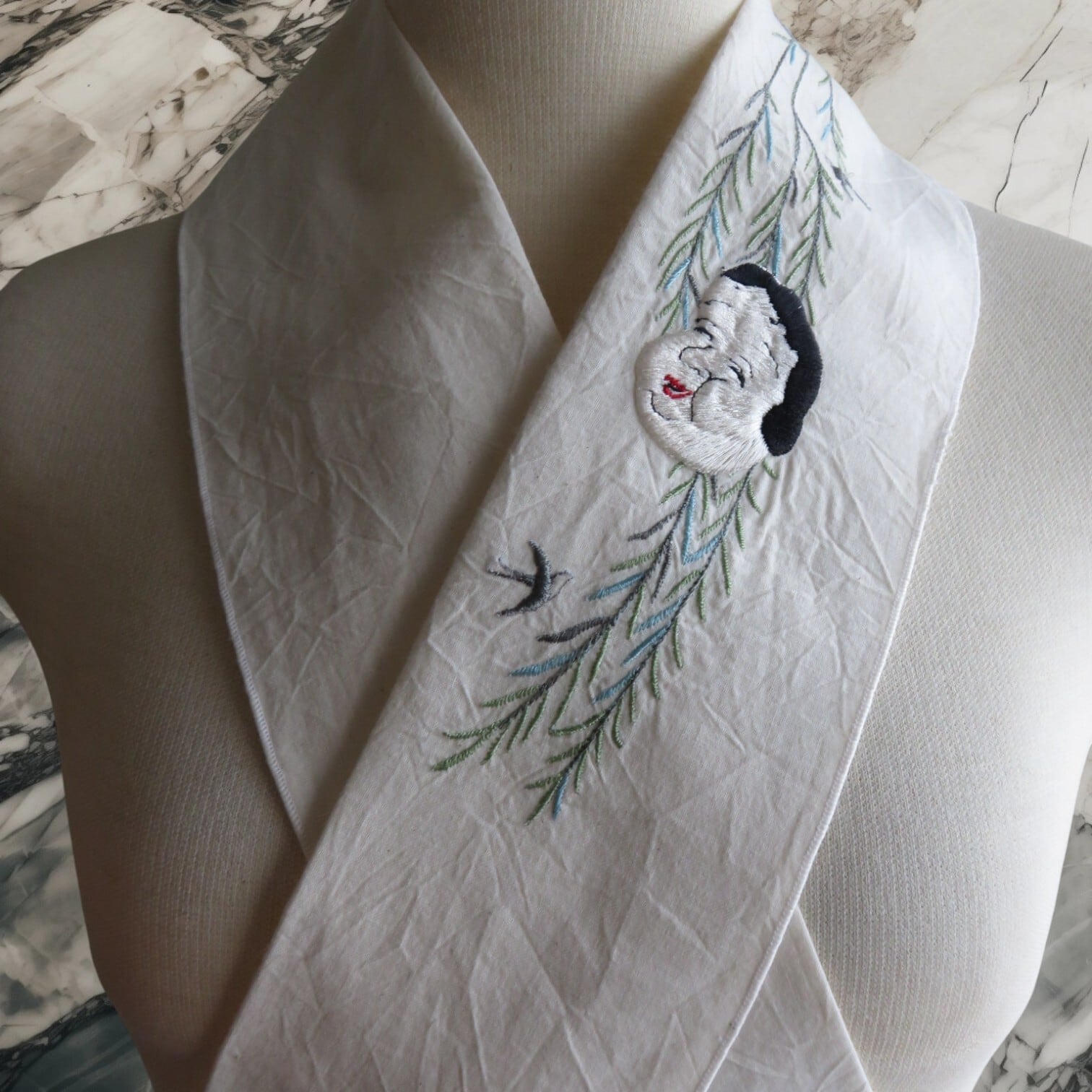 福々しいお多福さんと、春告げ鳥といわれるツバメと柳の粋な半襟です。