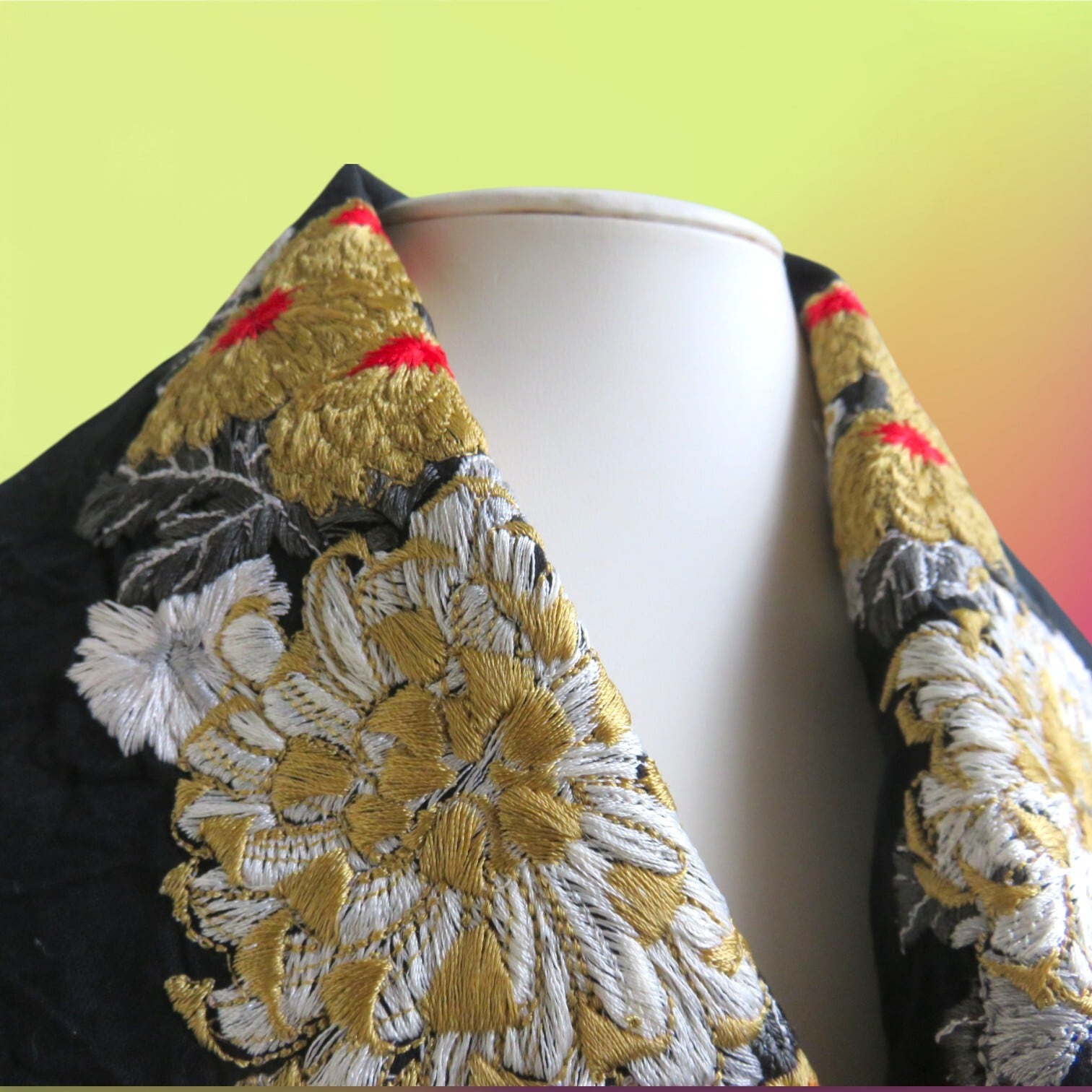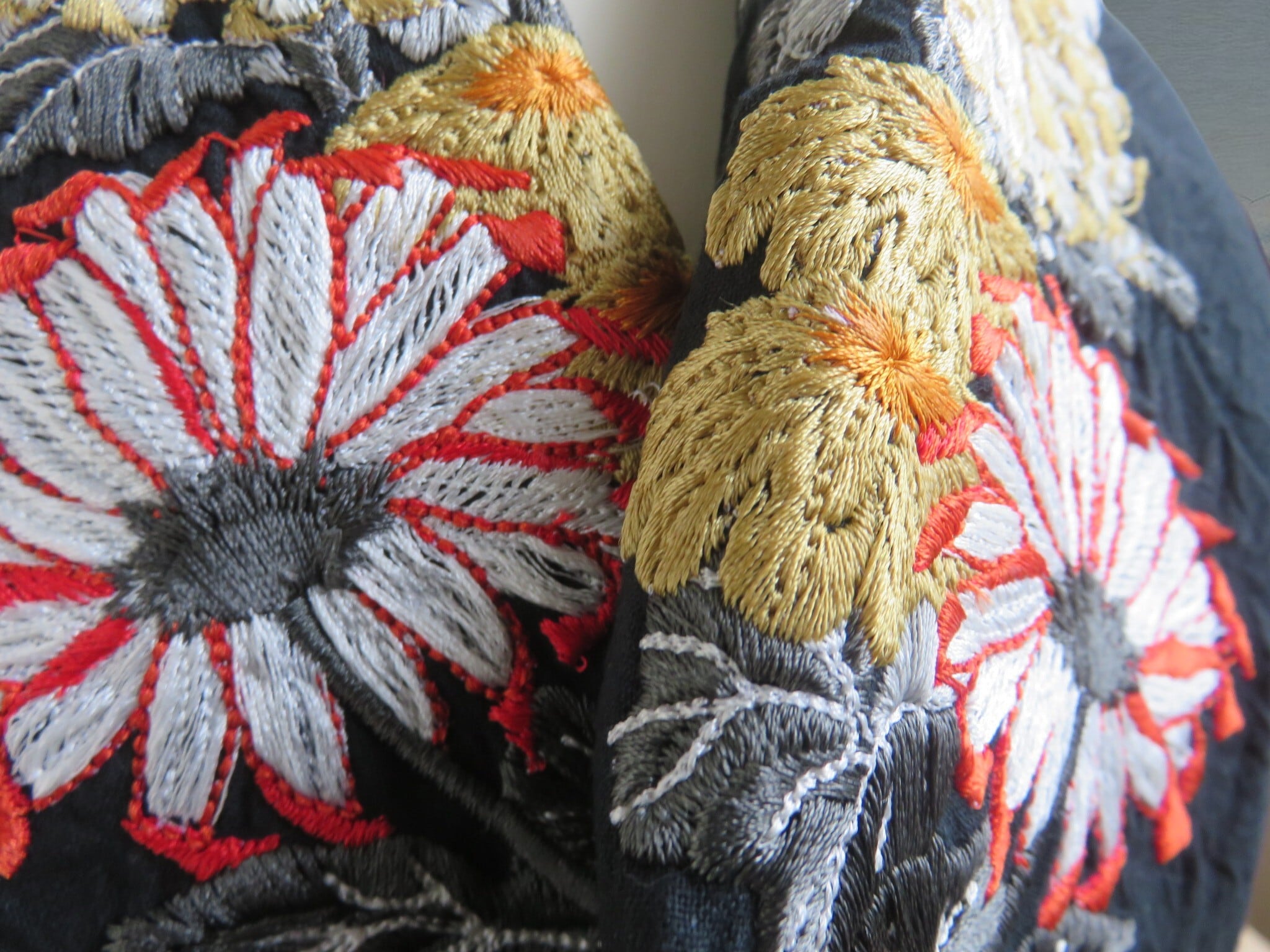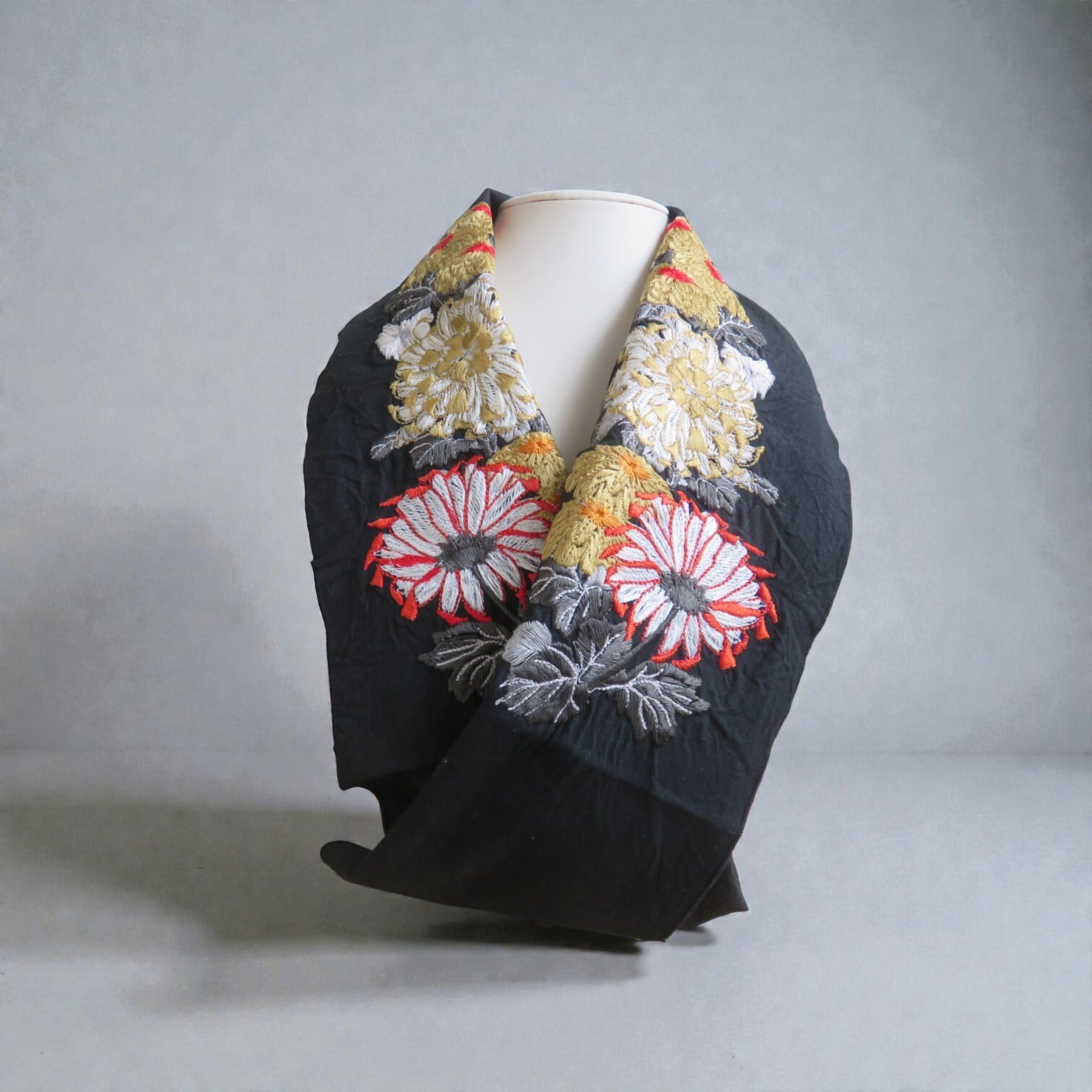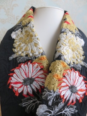 刺繍半衿・菊の競演(黒布ハンドワッシャー)赤色の効いた一枚