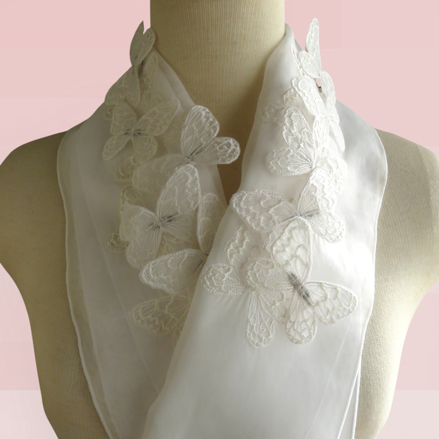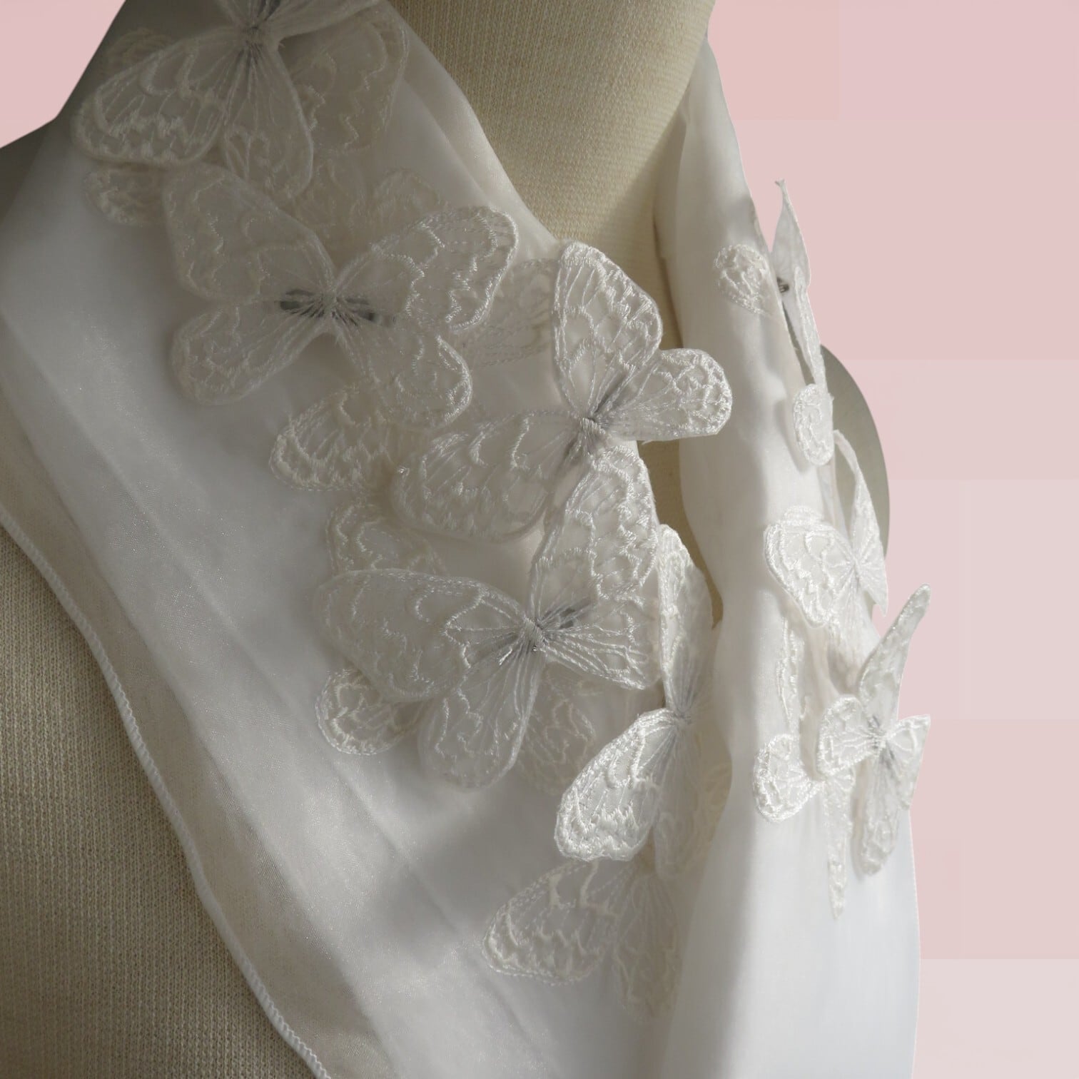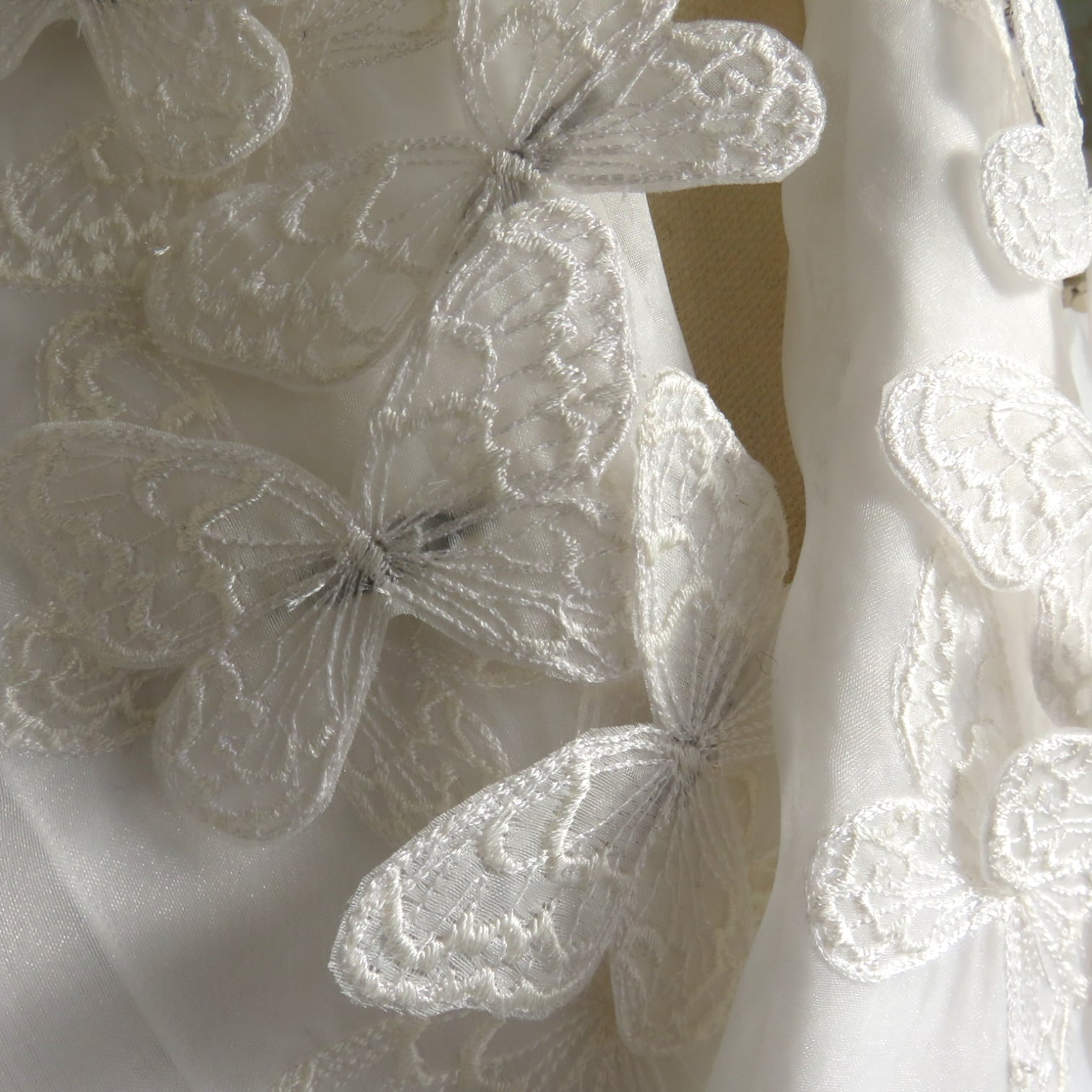 白いオーガンジーに白のバタフライを刺繍しました、