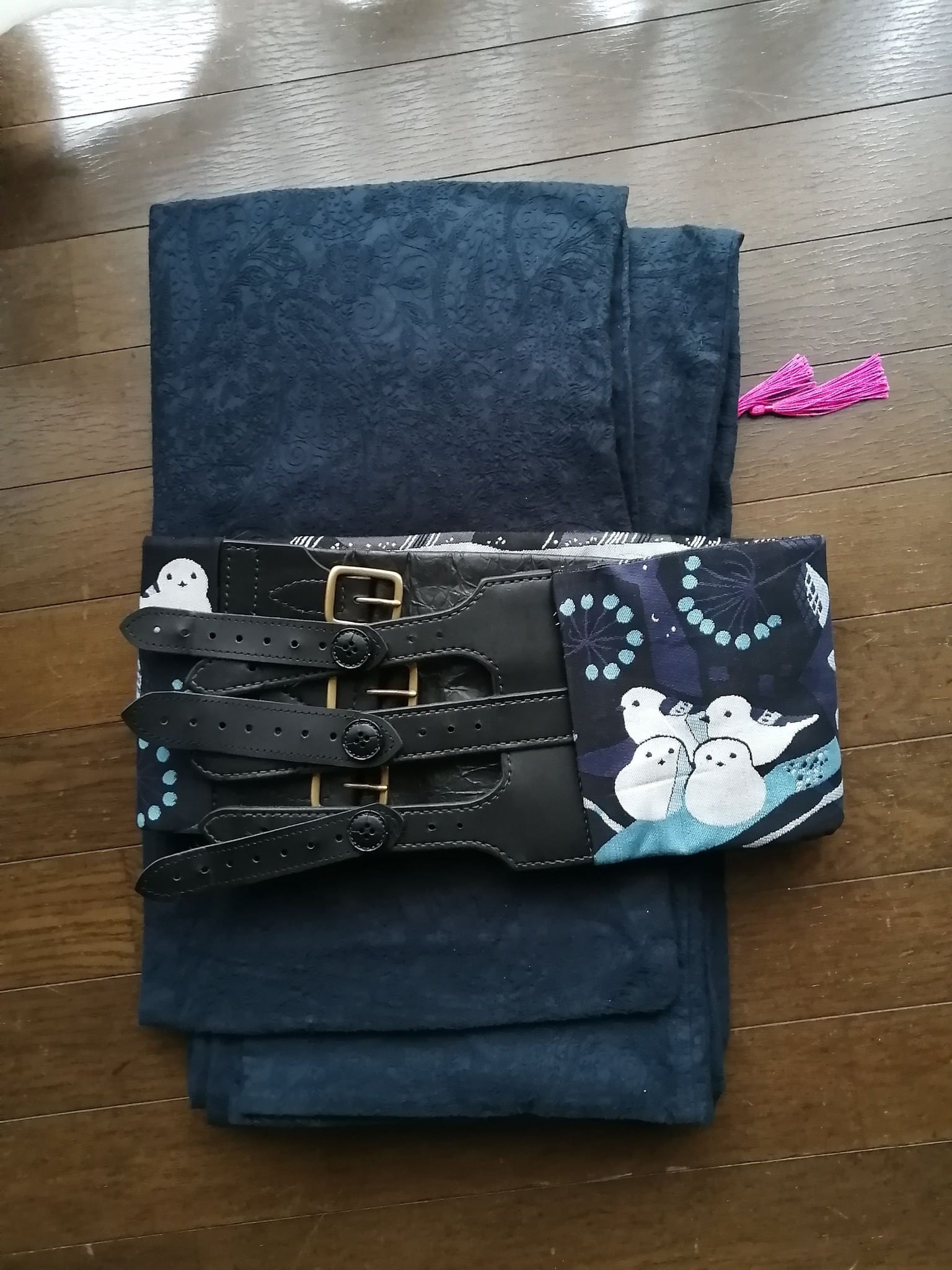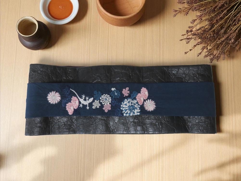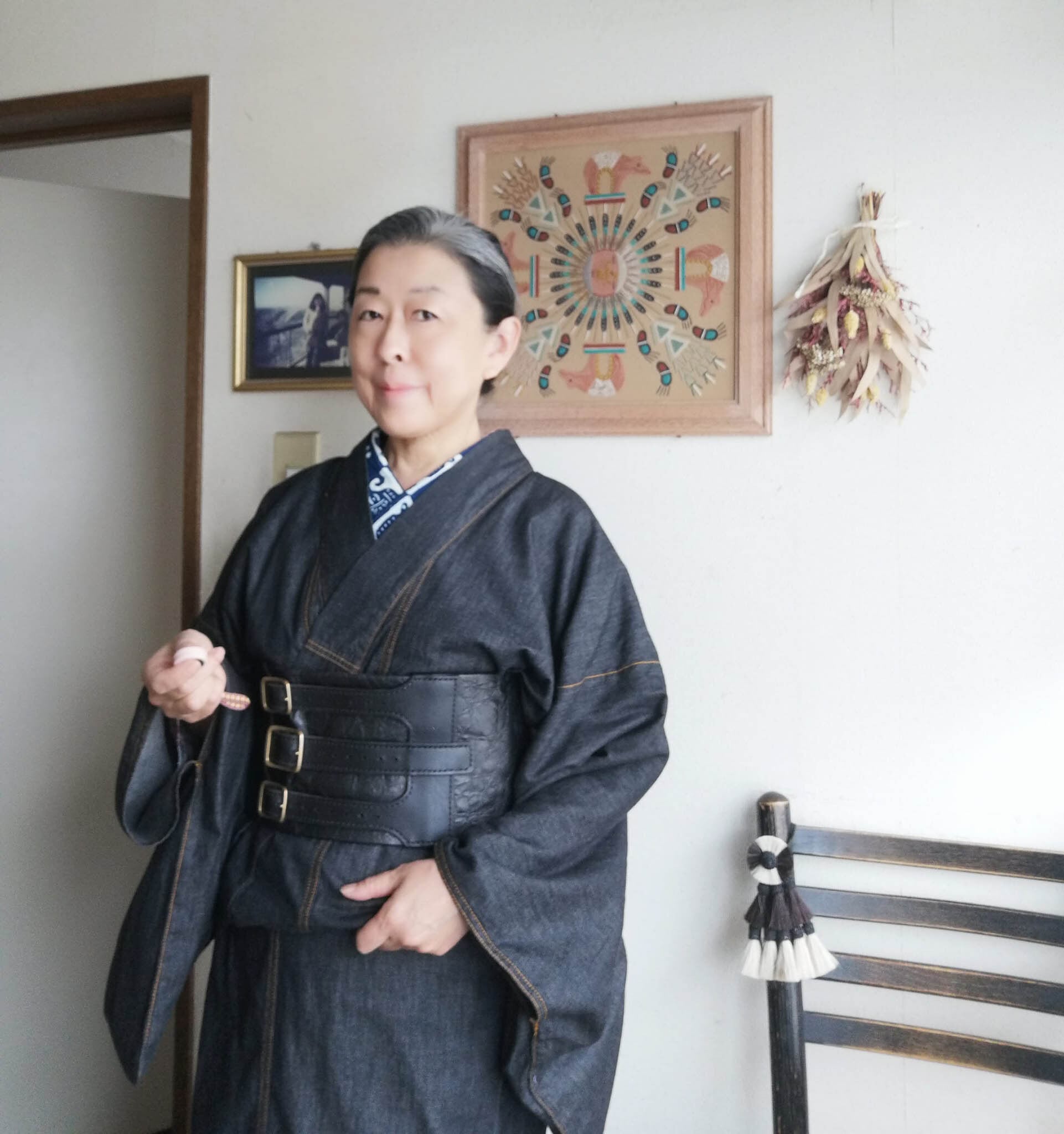 半幅帯を切って帯ベルトにはめてみました。雰囲気がガラッと変わってかっこいいです!