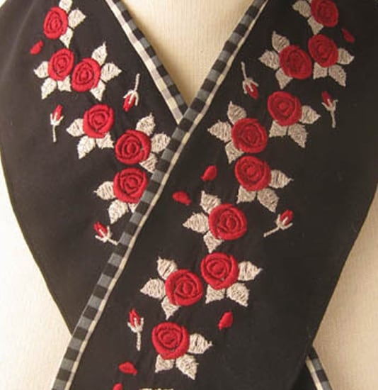 白黒チェック地に薔薇の花を赤糸とグレイ糸で刺繍した