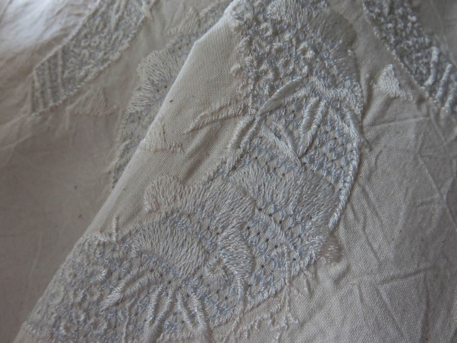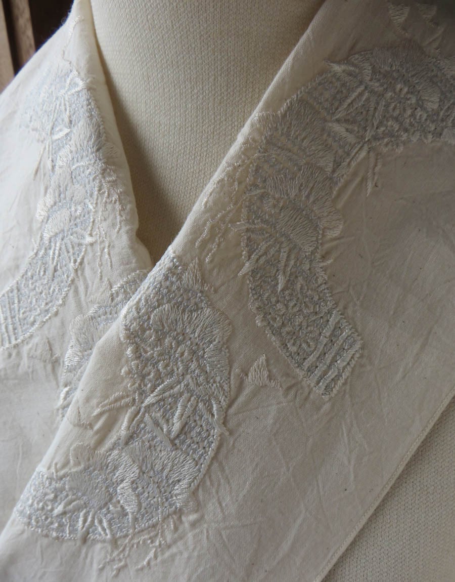 松竹梅の絵柄を生成り色の布に白糸で刺繍をして